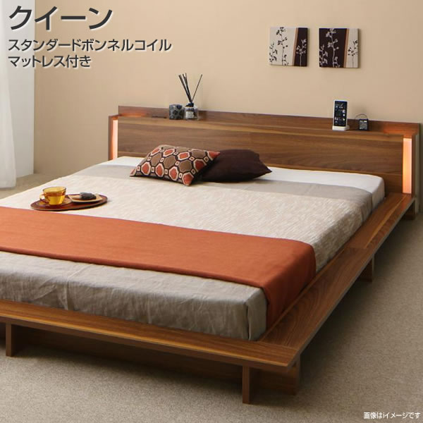 ローベッド クイーン (Q×1) ベッド スタンダードボンネルコイルマットレス付き 幅186×長さ219×高さ44cm 照明付き ライト付き 棚付き 宮付き コンセント付き 木製 サイドテーブル 幅木よけ 床板 カビ対策 簡単組立 ウォルナットブラウン